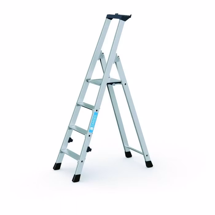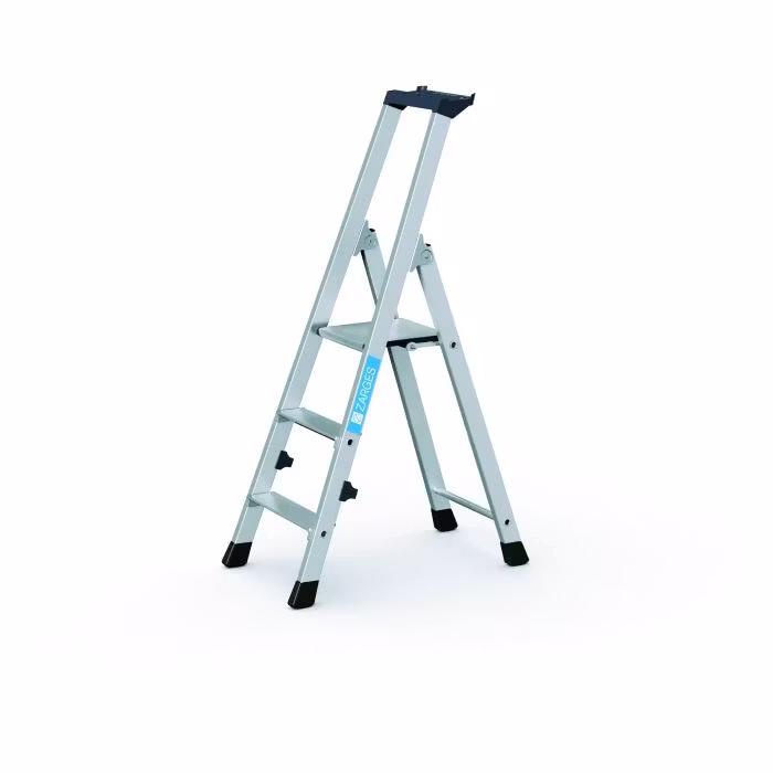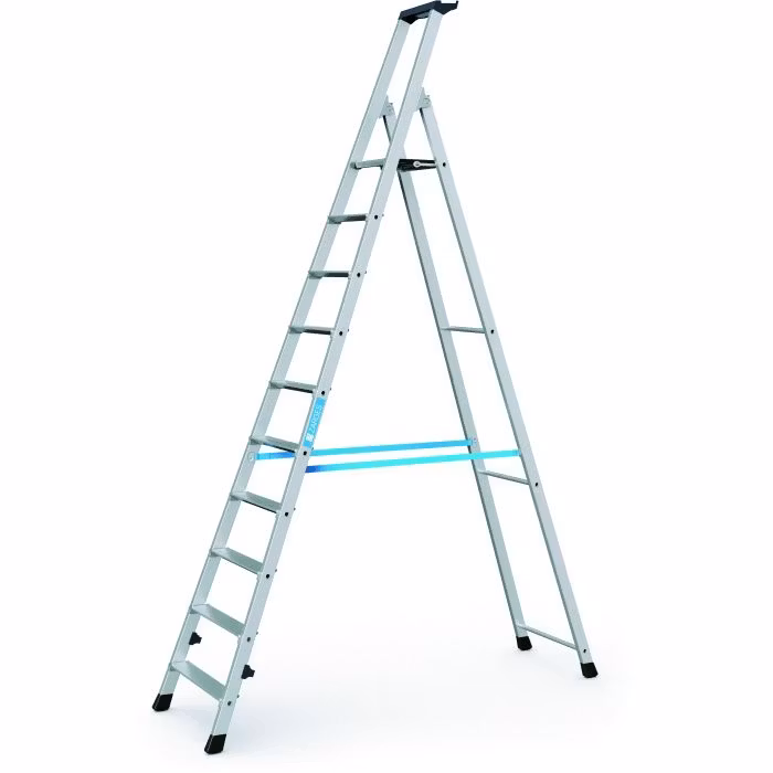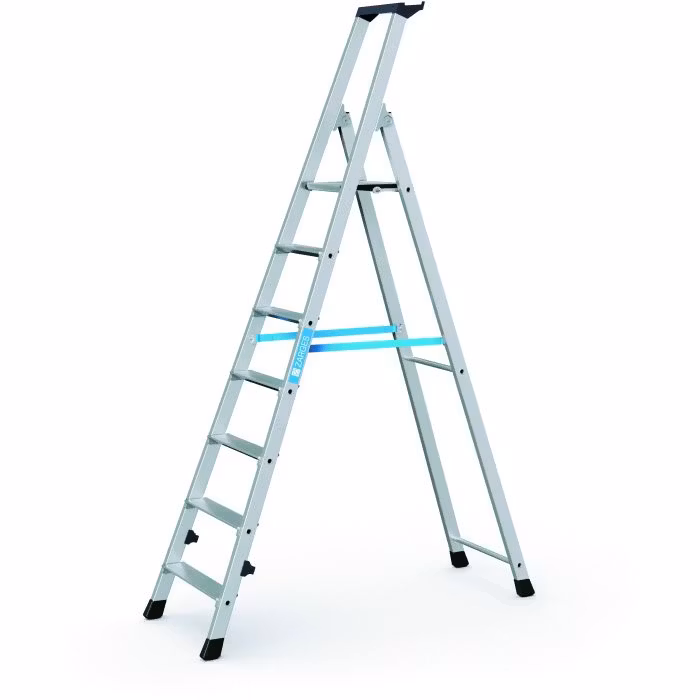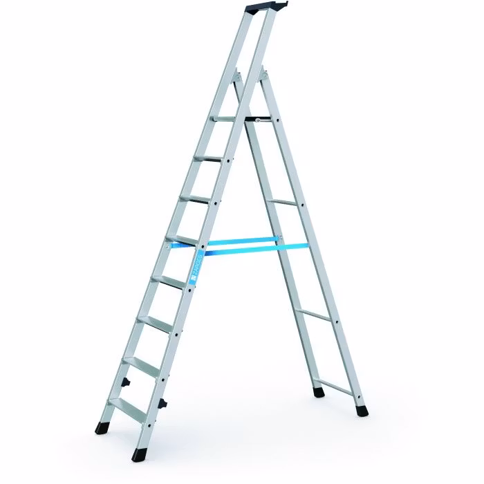 Klassisk trappstege för bekvämt arbete med praktisk verktygshylla och mycket stabil, patenterad förbindelse mellan steg och stegsida.